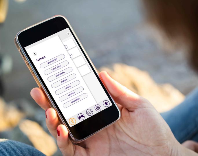Apenas com 1 toque é possível executar um conjuto de ações, chamadas de Cenas, com elas você pode desligar todas as luzes e equipamentos, preparar o ambiente antes de sua chegada, passar de um clima de jantar para filmes, basta 1 toque nas cenas disponíveis no APP.